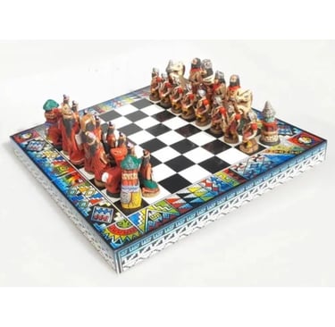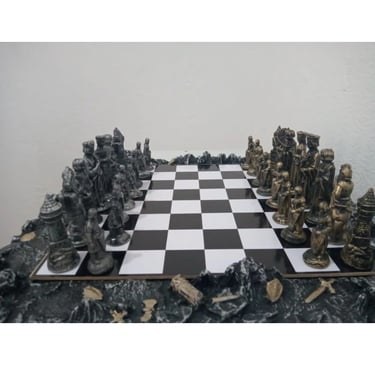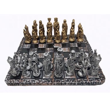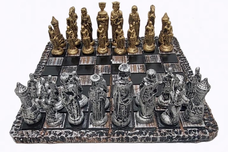 Começando com o primeiro: o Jogo de Xadrez Medieval de 38 por 38 centímetros. As peças são de resina, bem detalhadas, parece coisa de museu, só que tá na promoção, então corre antes que acabe.