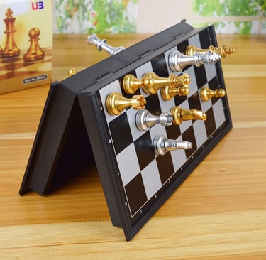 No terceiro, temos o clássico dos clássicos: Xadrez Magnético de 32 por 32 centímetros. Ideal pra levar pra qualquer canto sem perder as peças no meio do rolê. Esse é aquele que você usa pra jogar com teu vô ou com aquele teu primo mala.