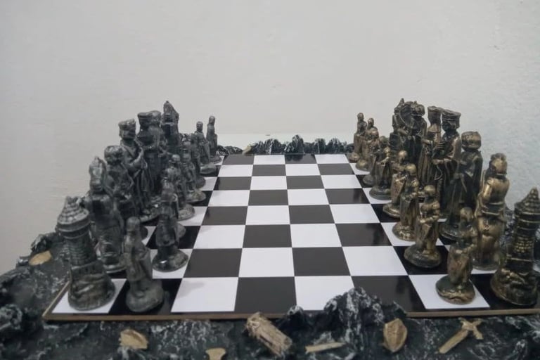 O segundo é praticamente o irmão mais compacto, o Xadrez Medieval de 28 por 28 centímetros. Mesmo estilo, mesmo visual de época, só que perfeito pra quem quer algo menor e mais prático. Eu sou meio burro e não percebi a diferença, mas se você percebeu comente aqui embaixo.