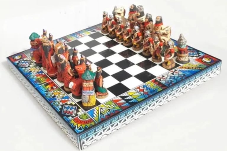 O quarto é diferente, mano: o Xadrez Temático Peruano dos Incas, medindo 26 por 26. É bonito demais, com peças inspiradas na cultura andina, uma verdadeira obra de arte em forma de jogo.