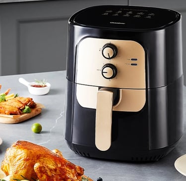 A Air Fryer Gaabor de 5,5 litros combina elegância e desempenho em um só produto. Seu design sofisticado com acabamento dourado adiciona um toque de luxo à sua cozinha. Com controle analógico de tempo e temperatura, esta Air Fryer oferece praticidade na preparação de refeições saudáveis.